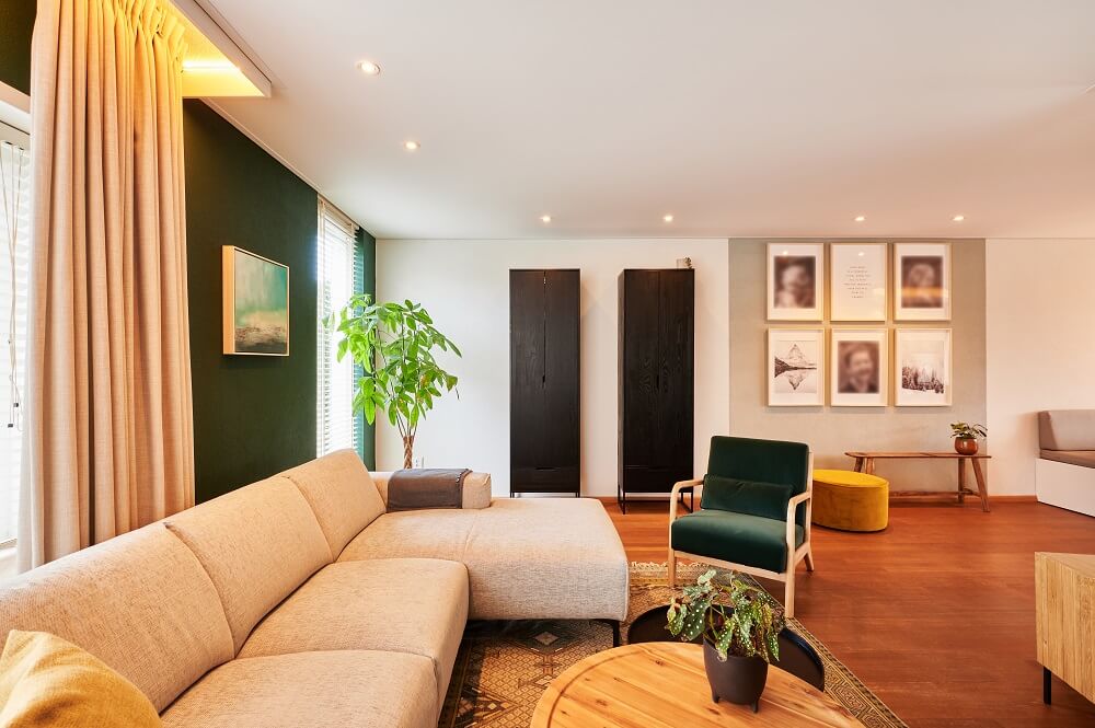Mit bunt-verstellbaren Lichtfarben und einer hinterleuchteten Spannwand mit farbenfrohem Print kommt Farbe und Licht ins Leben. Absolut passend für das gemütliche Zuhause einer fünfköpfigen Familie. Auf 65 Quadratmeter Wohnfläche wurde eine Spanndecke in Mattweiß gespannt, inklusive vieler toller Lichtoptionen, die Eltern und Kinder gleichermaßen begeistern. Neben der umlaufenden LED-Line mit Farbwechselfunktion im Musik- und Spielbereich wird die relativ dunkle Küchenecke mit einem biodynamischen Lichtmodul erleuchtet, dessen Lichtintensität von taghell bis kuschelig-warm verstellbar ist. Nie wieder elterlich-müde Blicke am frühen Morgen! Auch die Einbaustrahler sind dank Tunable-White-Technologie vollständig dimmbar, genau wie die indirekte Beleuchtung hinter der Gardinenblende.